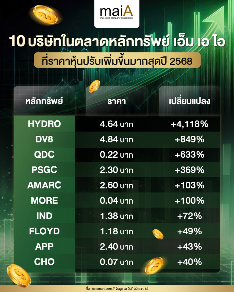 10 บริษัทในตลาด mai ที่ราคาหุ้นเพิ่มขึ้นมากสุดปี 2568