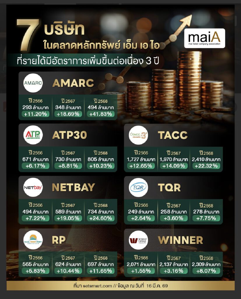 7 บริษัทในตลาดหลักทรัพย์ mai ที่รายได้มีอัตราการเพิ่มขึ้นต่อเนื่อง 3 ปี